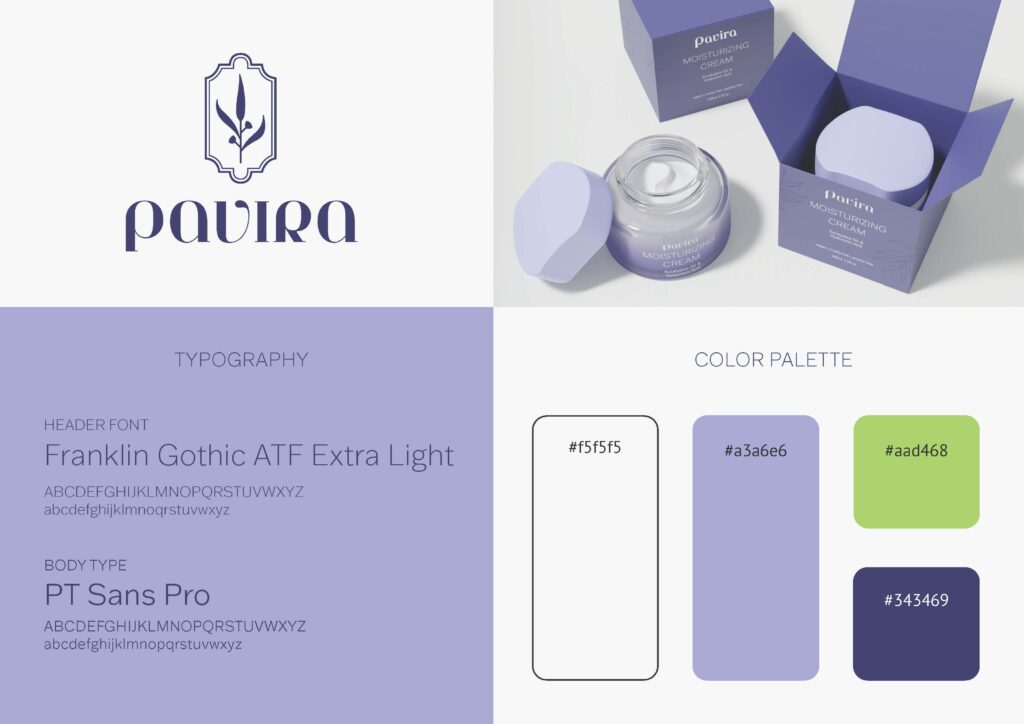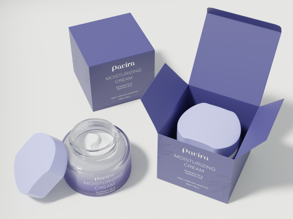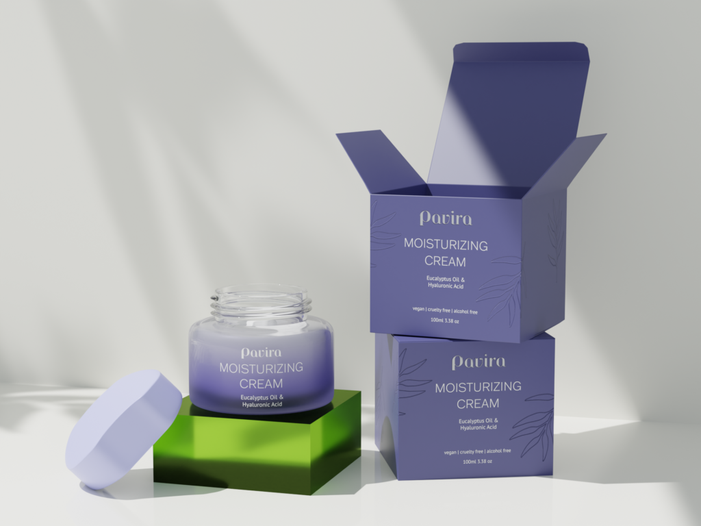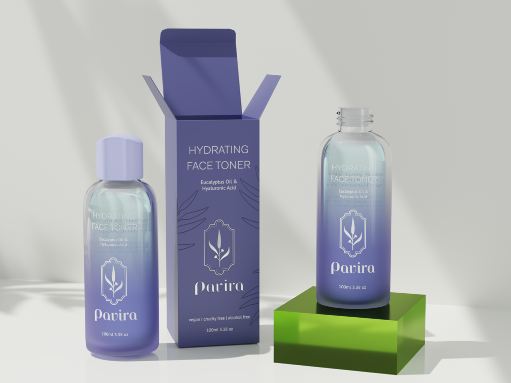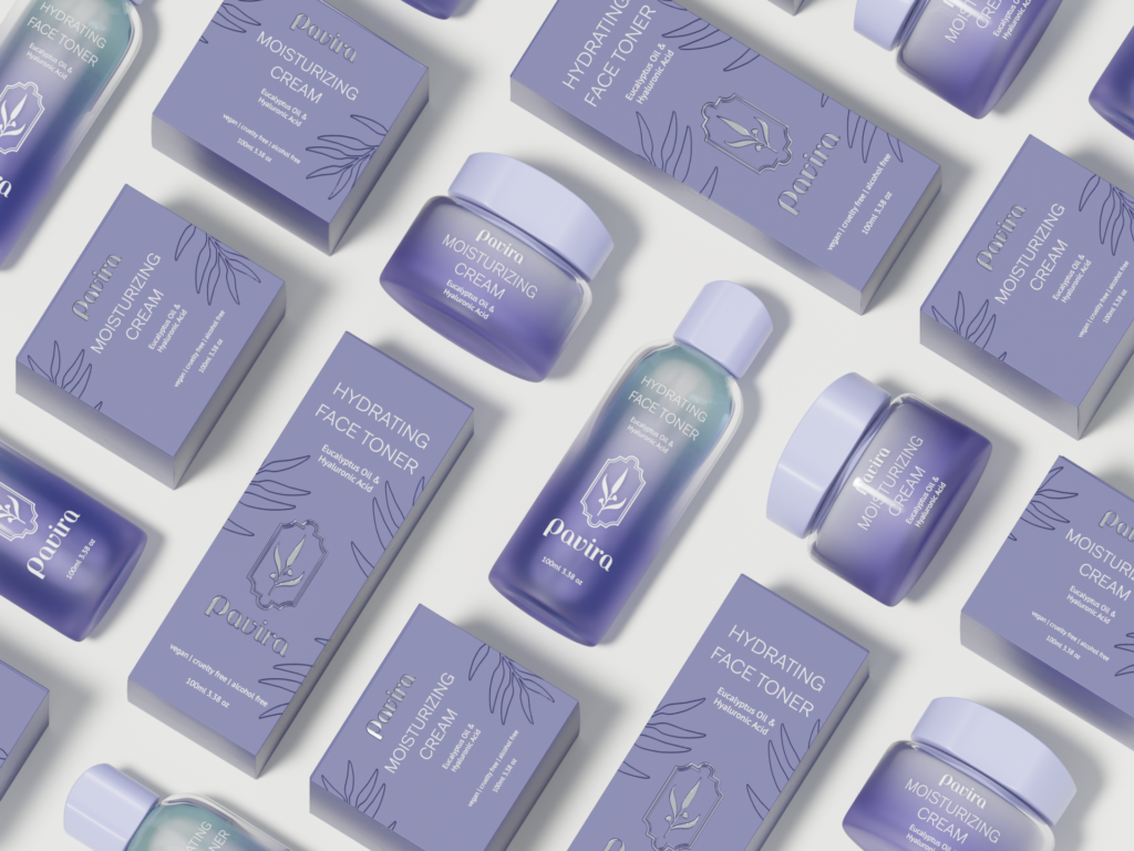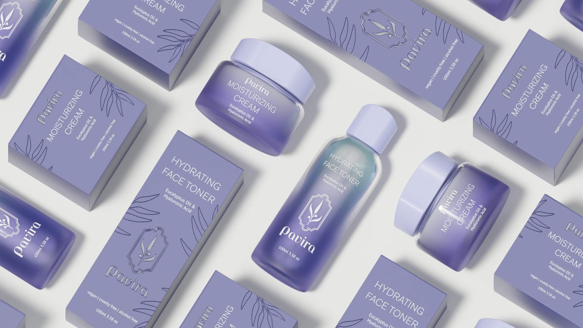 Pavira is a fictional skincare brand focusing on simple formulas with key ingredients and high origin transparency. The brand targets young people of all genders with price range between drugstore and luxury level. The mockups made with blender show a hydrating face toner and moisturizing cream, both with Eucalyptus Oil and Hyaluronic Acid.
