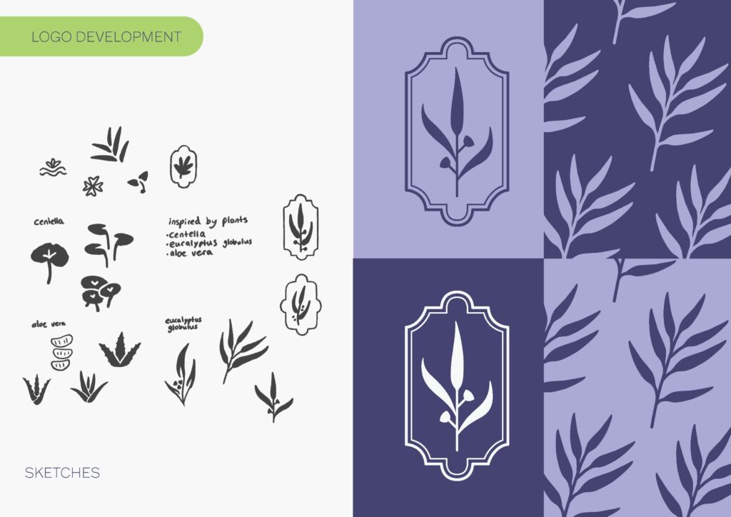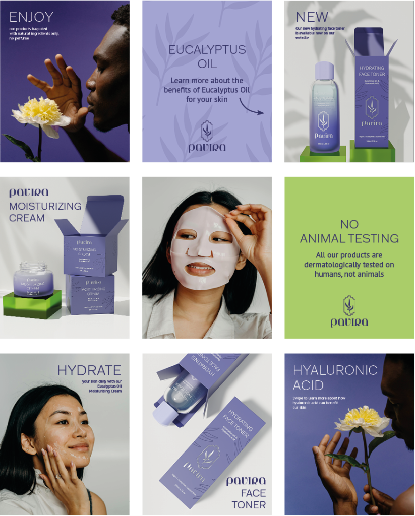 After establishing the core values of the brand, the color palette and primary typography was chosen. For the logo and brandmark, several sketches were made in photoshop of different plants and then refined and finalized in Illustrator. The face toner, moisturizer and packaging were modeled in blender and textured with blender texture nodes as well as Illustrator for patterns and texts. Additionally you can see an example of a social media feed below.